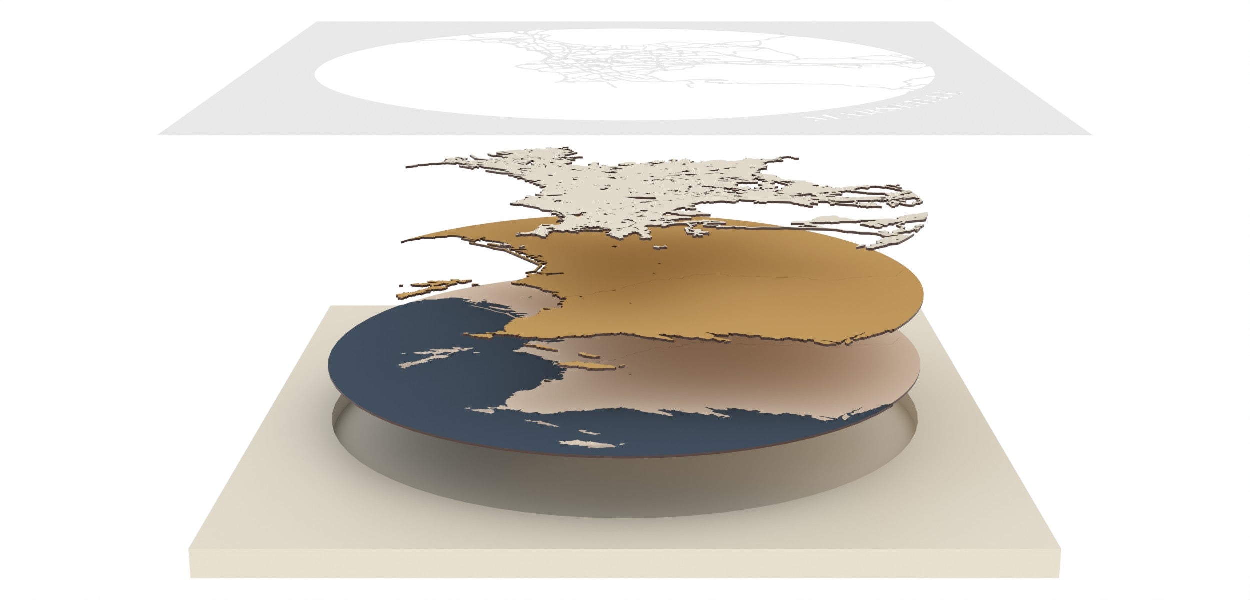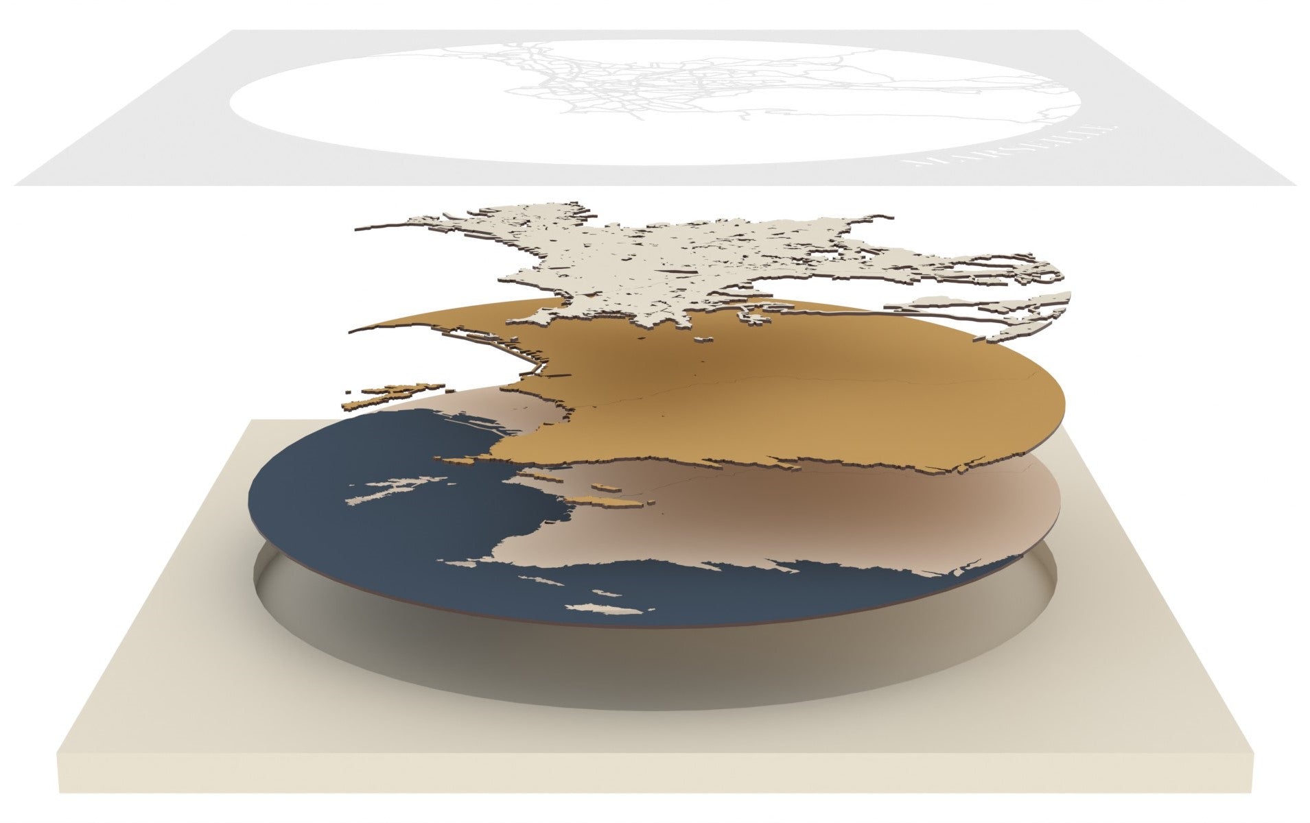 La ville est représentée comme une superposition de couches, où les routes et le bâti viennent masquer la nature.